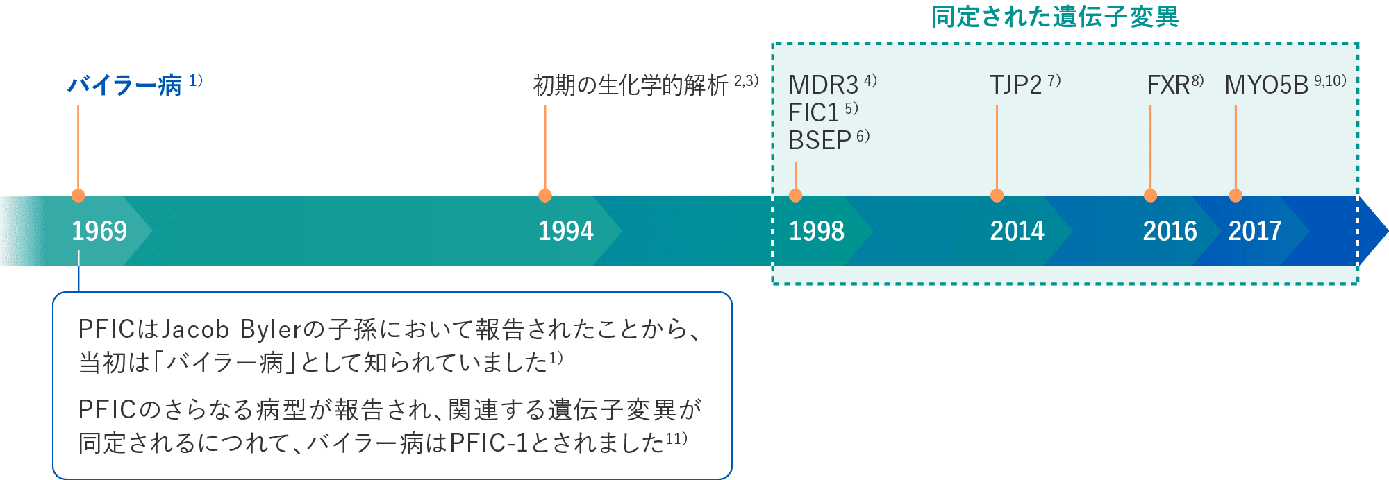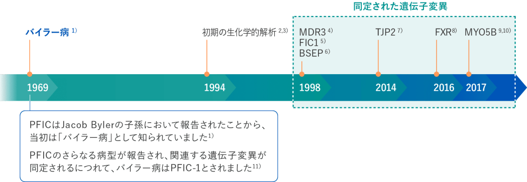 1)Clayton RJ, et al. Am J Dis Child. 1969;117(1):112-124. 2)Jacquemin E, et al. Eur J Pediatr. 1994;153(6):424-428. 3)Whitington PF, et al. J Pediatr Gastroenterol Nutr. 1994;18(2):134-141. 4)de Vree JM, et al. Proc Natl Acad Sci USA. 1998;95(1):282-287. 5)Bull LN, et al. Nat Genet. 1998;18(3):219-224. 6)Strautnieks SS, et al. Nat Genet. 1998;20(3):233-238. 7)Sambrotta M, et al. Nat Genet. 2014;46(4):326-328. 8)Gomez-Ospina N, et al. Nat Commun. 2016;7:10713. 9)Gonzales E, et al. Hepatolgy. 2017;65(1):164-173. 10)Qiu YL, et al. Hepatology. 2017;65(5):1655-1669. 11)Davit-Spraul A, et al. Orphanet J Rare Dis. 2009;4:1.