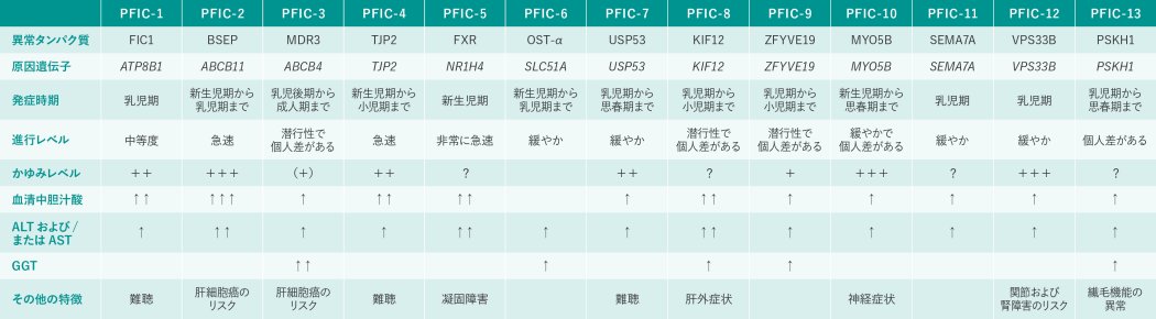 - 最もよく知られているPFIC遺伝子はATP8B1、ABCB11、ABCB44)
