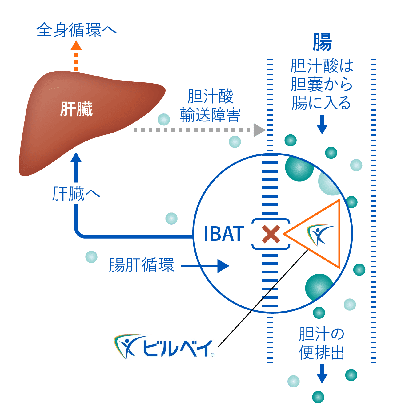 - ビルベイは腸管で回腸胆汁酸トランスポーター(IBAT)に可逆的に結合するIBAT阻害剤です。門脈系への胆汁酸の再取り込みを減少させることで、血清胆汁酸濃度を低下させます。