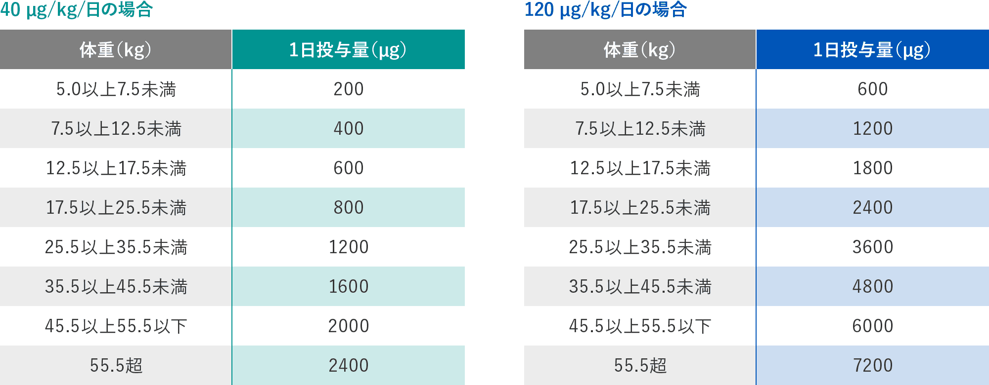体重別の1日投与量は下表を参考にすること。