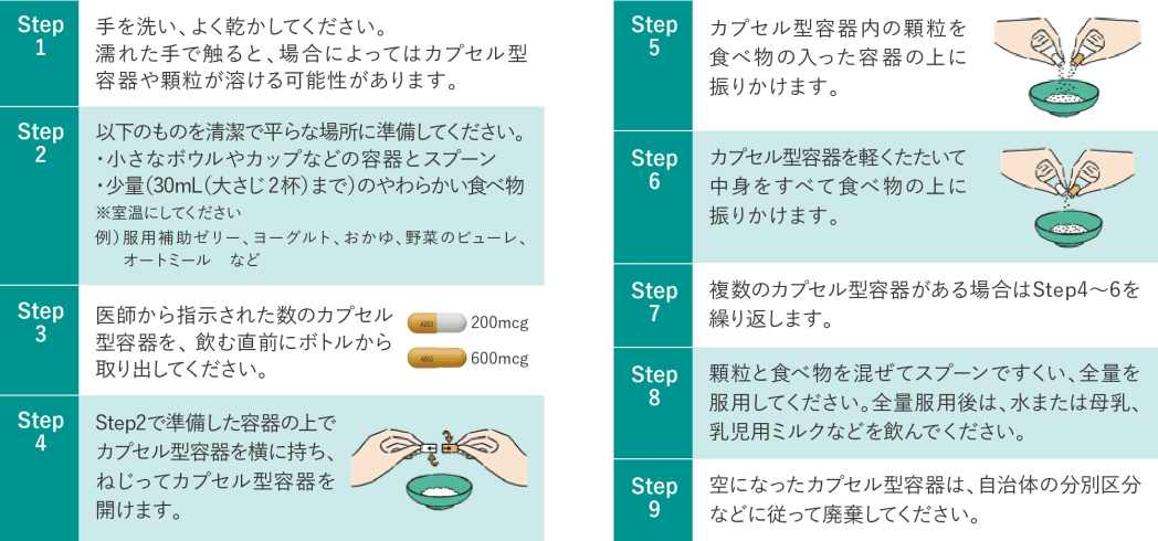 カプセル型容器を開けて、柔らかい食べ物または飲み物に混ぜて服用します