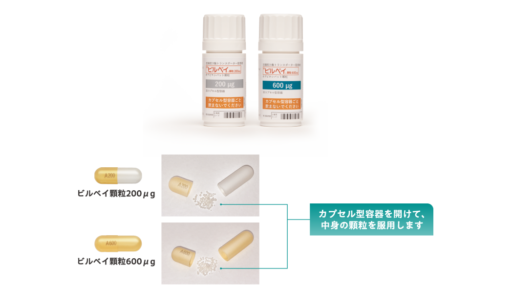 - ビルベイはカプセル封入顆粒剤です。カプセルを開けて顆粒を飲食物に混ぜて服用します。朝食時1日1回投与です。
